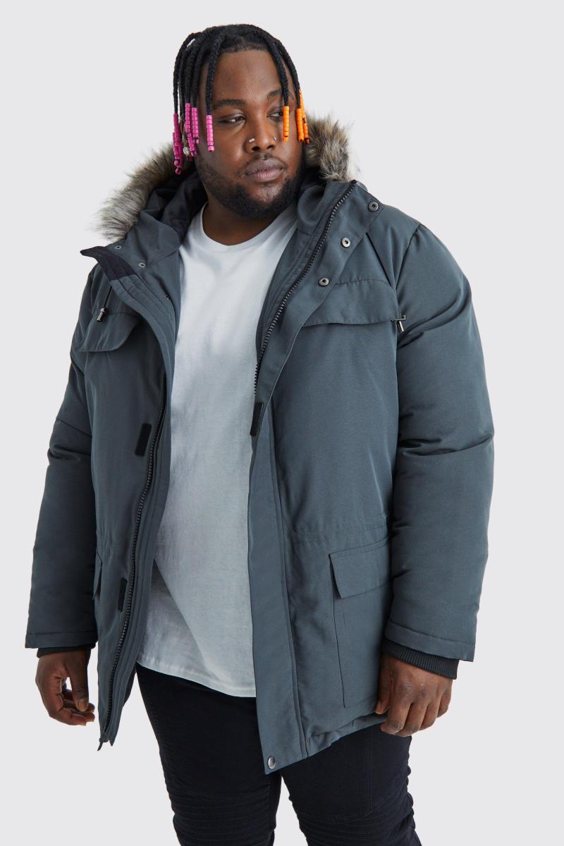 Крім того, вугільна куртка-парка з капюшоном зі штучного хутра